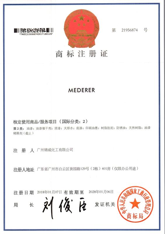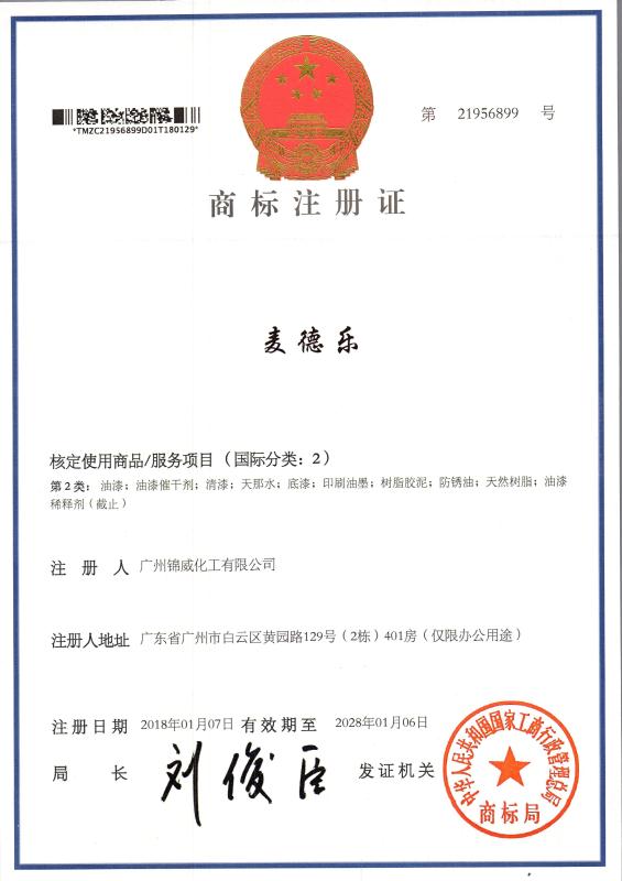 近日我司順利獲得國(guó)家商標(biāo)總局頒發(fā)的“商標(biāo)注冊(cè)證”,在取得商標(biāo)注冊(cè)證的同時(shí),也為錦威化工的進(jìn)一步發(fā)展奠定了基礎(chǔ),為公司在發(fā)展及 擴(kuò)大的道路上的維權(quán)提供了堅(jiān)實(shí)的法律保障。