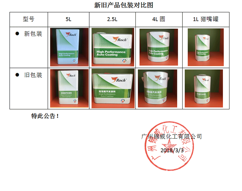 為了配合公司市場戰(zhàn)略發(fā)展,滿足客戶需求,公司自2018年3月3日起,公司旗下品牌“Roch”系列產品陸續(xù)啟用新的產品外包裝。“Roch”品牌自上市以來公司就定位其為出口以及國內電商品牌專供品牌。所以其新包裝罐體將全部采用英文。新包裝產品與舊包裝產品均屬廣州錦威化工有限公司生產,所有產品質量不變,請廣大客戶放心使用!